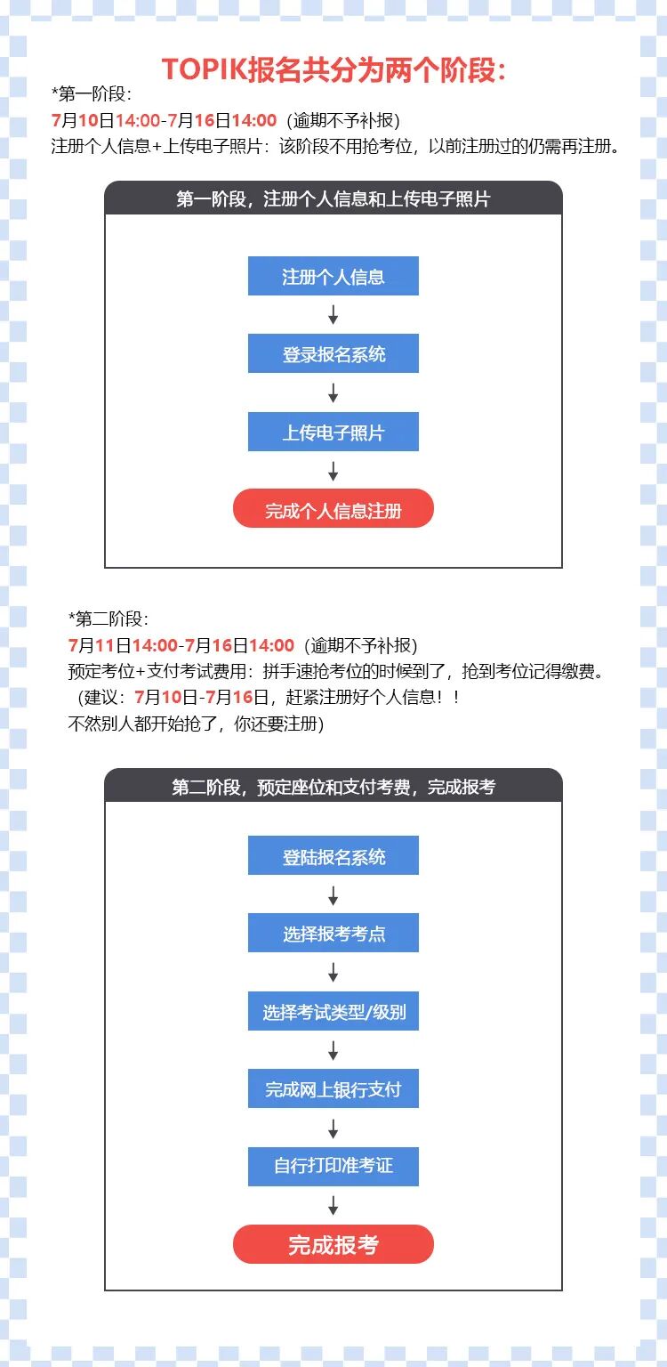 将于今年10月举行的96届TOPIK考试报名时间从7月10日开始。为了让大家能够更顺利地进行报考,今天为大家整理了国内报名流程。希望大家报名顺利、考试顺利!关于考试如果还有其他疑问随时欢迎留言提问~