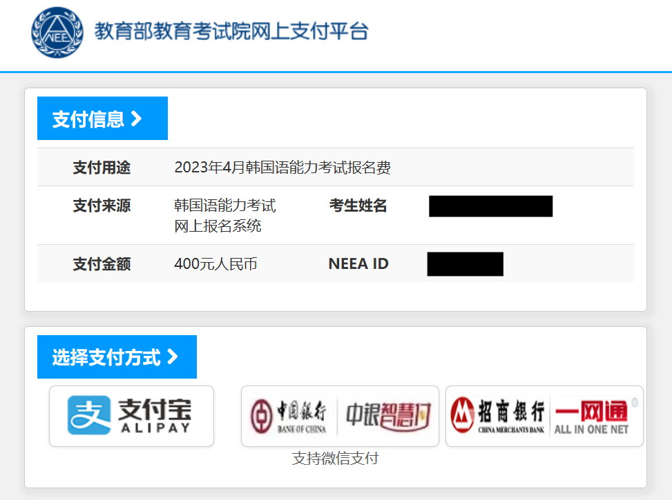 2)支付方式可选择支付宝/微信/中国银行中银智慧付/招商银行一网通。